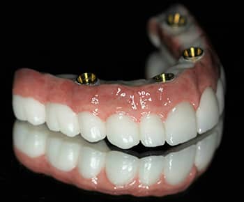 Includes 4 Dental Implants, extractions, fixed acrylic temporary teeth on first trip, zirconia full arch restoration final teeth